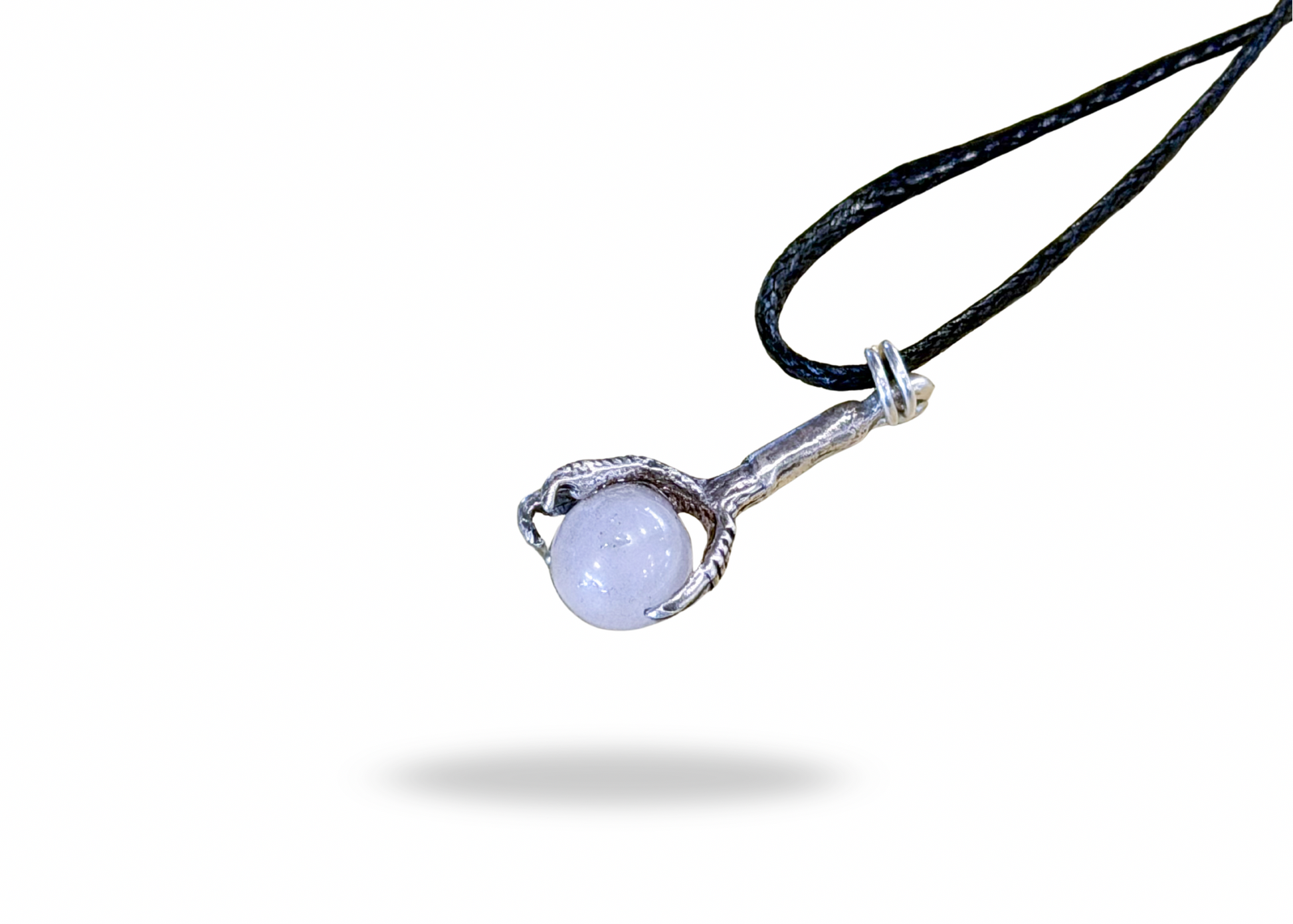 This cast bird claw is solid sterling silver, clutching a rose quartz ball, and hangs from a waxed cotton necklace. 16 inches with sterling clasp.