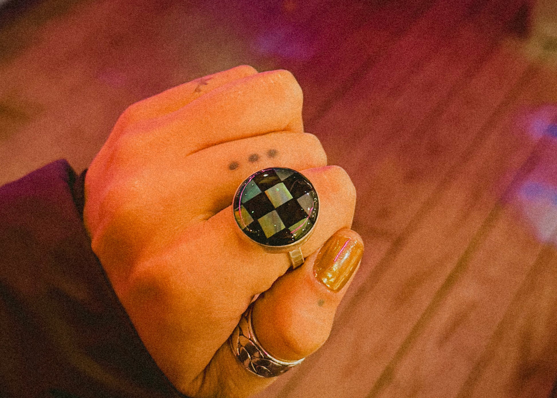 This sterling silver ring was handmade by me!! It has a big round Aurora Opal checkered stone and a hammered size 10.5 band.