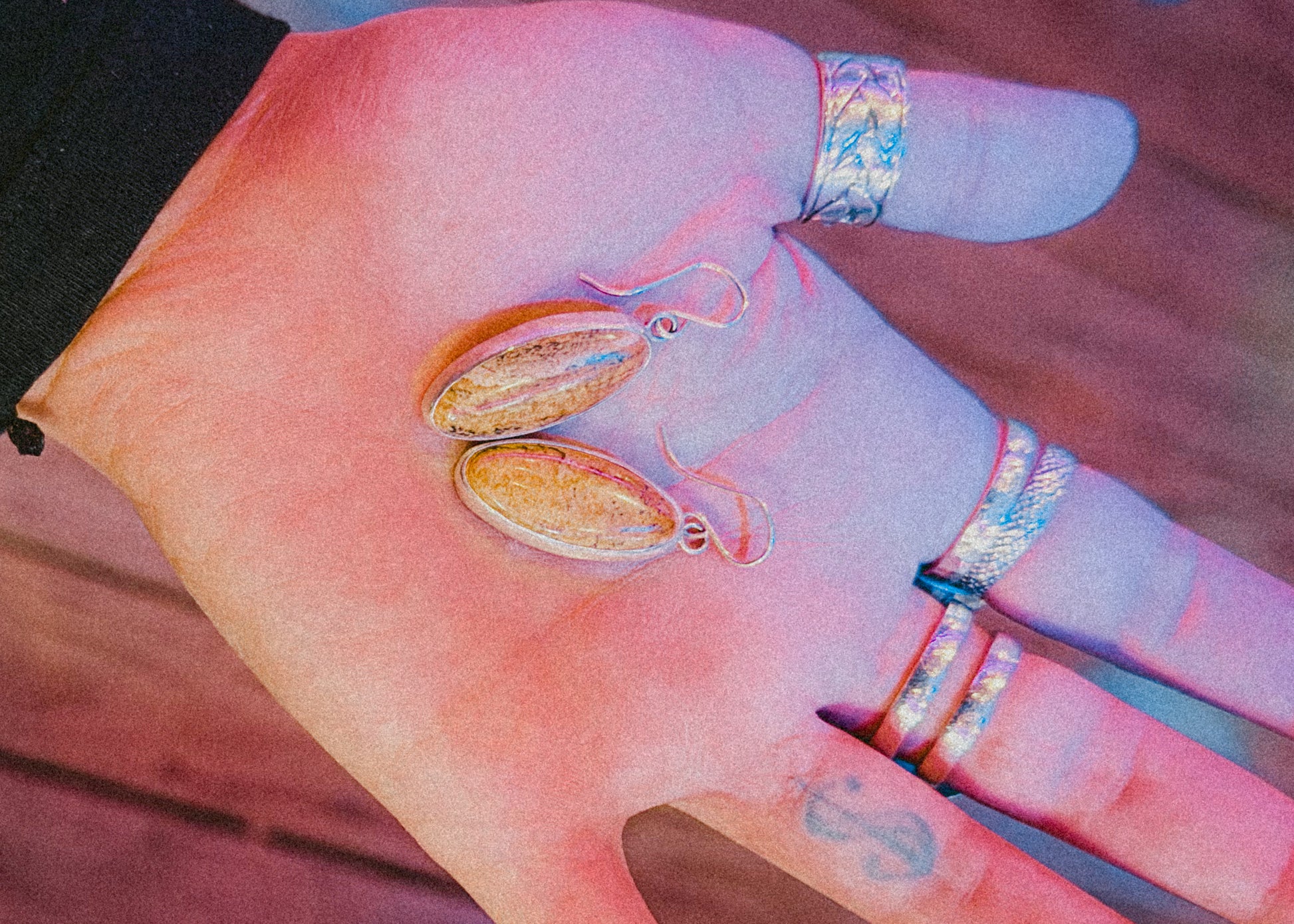 These earrings are all about the stone. Picture jasper stones are set in fine silver and brass, and finished with sterling silver ear wires. They’re pretty light for being rocks, and are just over an inch long.