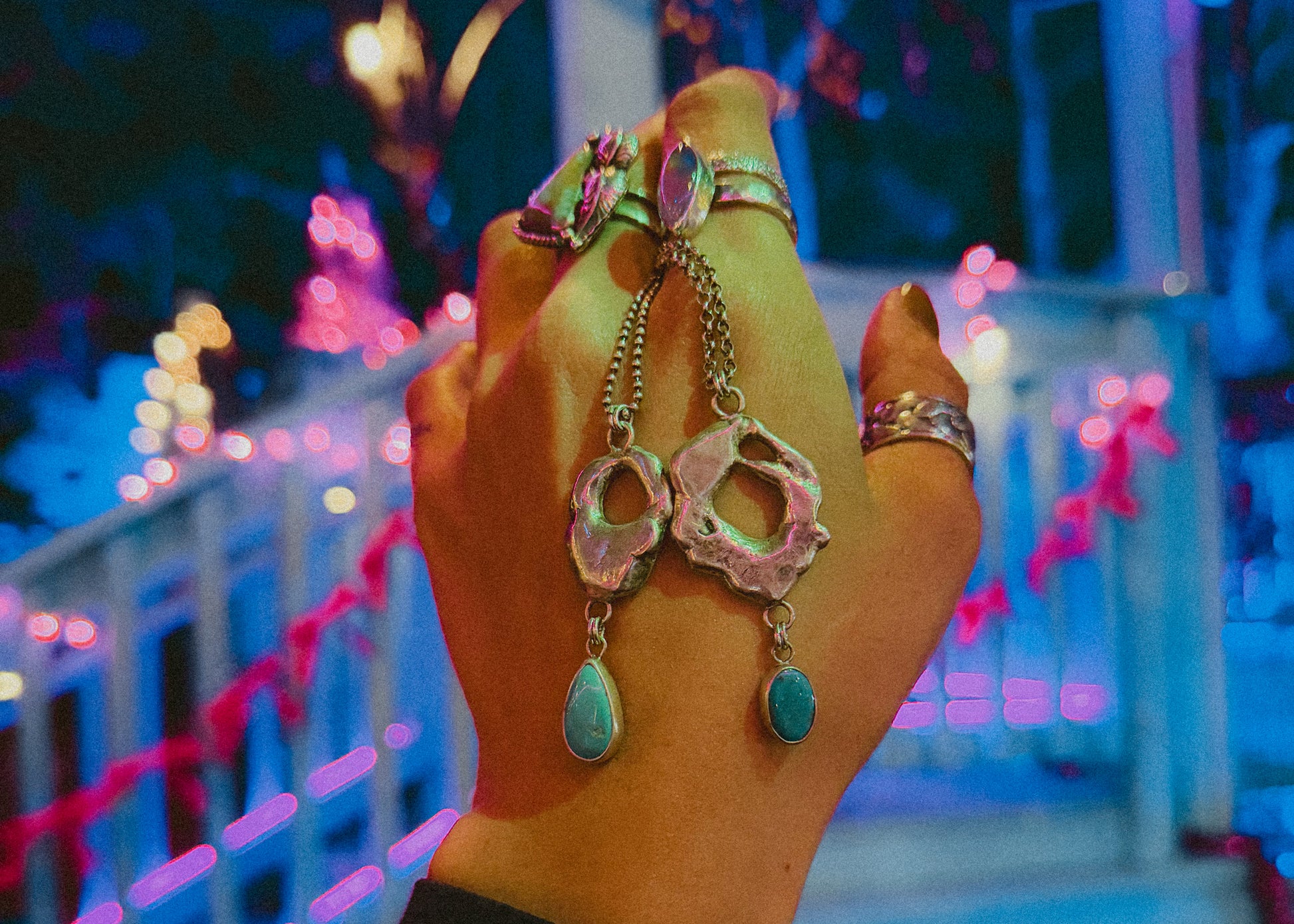 This sterling silver necklace was made with a huge chunk of solid metal and a classic Royston Turquoise dangle. It’s on a 16” ball chain.