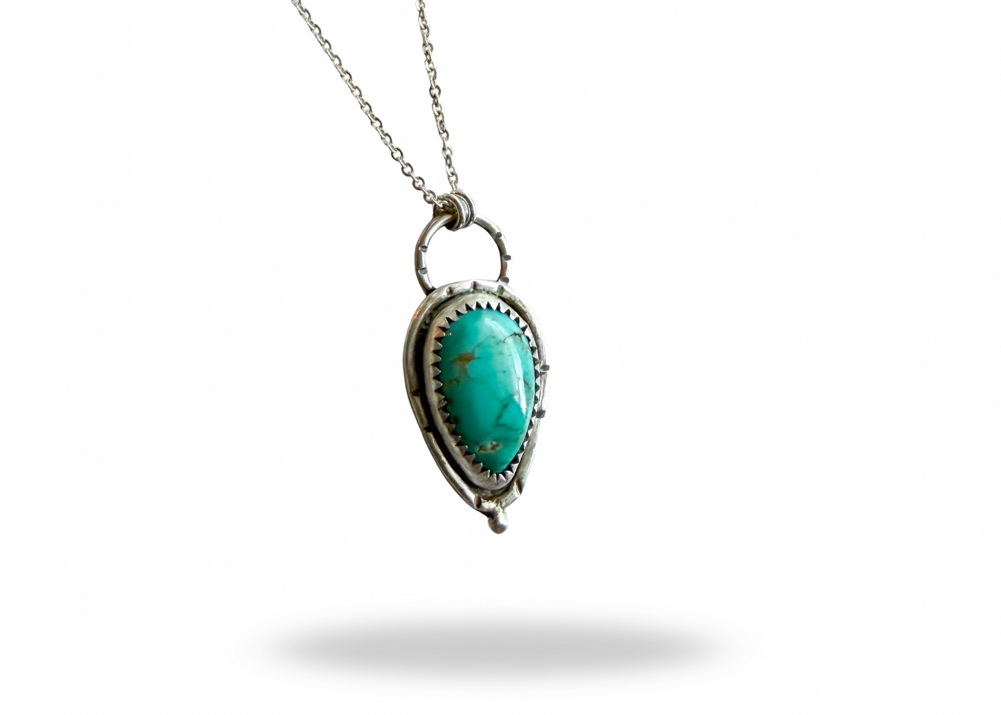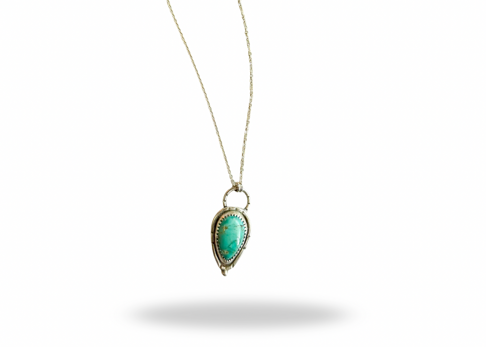 This sterling silver pendant was handmade by me. It has a robin’s egg Royston Turquoise stone and some really pretty sterling embellishments. It’s on a fine adjustable chain that goes from 16” to 18” to 20”.